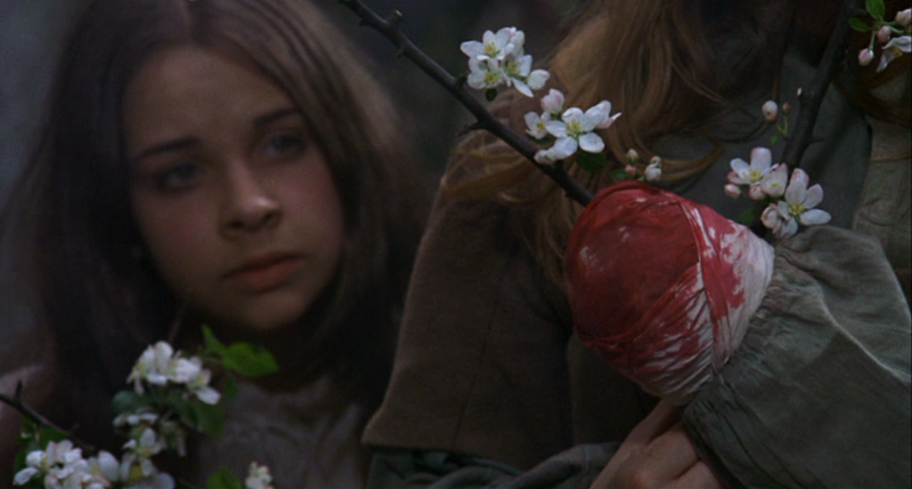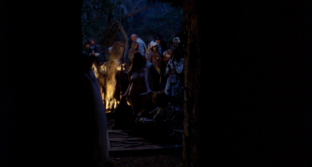 Cette population superstitieuse se voit affligée dans ce qu’elle possède à la fois de plus fragile et fécond : sa jeunesse. Sans défense, elle ne pourra que s’en remettre au bon-vouloir des notables de la région, des hommes éduqués – et donc sceptiques – pour qui la sorcellerie n’est qu’une pratique discréditée et abolie ; qui ne voient dans la marque du diable rien d’autre que l’apanage de ces charlatans qui paradaient, au XVIIe siècle, sous le masque de chasseurs de sorcières pour abuser de la crédulité des paysans. Des notables auxquels l’on se fie, car l’on n’a guère d’autre choix, mais dont la rhétorique et la sophistication n’empêchent en rien la disparition des enfants du village. Sous la houlette de l’ensorcelante Angel Blake, une Linda Hayden hallucinée et hallucinante de sensualité, ceux que l’on ne retrouve pas brutalement assassinés un beau matin rejoignent en masse la forêt pour s’y livrer à leurs jeux interdits sous les regards lascifs d’une congrégation qui s’enrichit de jour en jour de nouveaux membres.